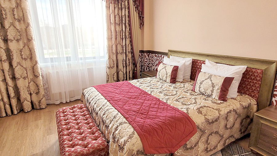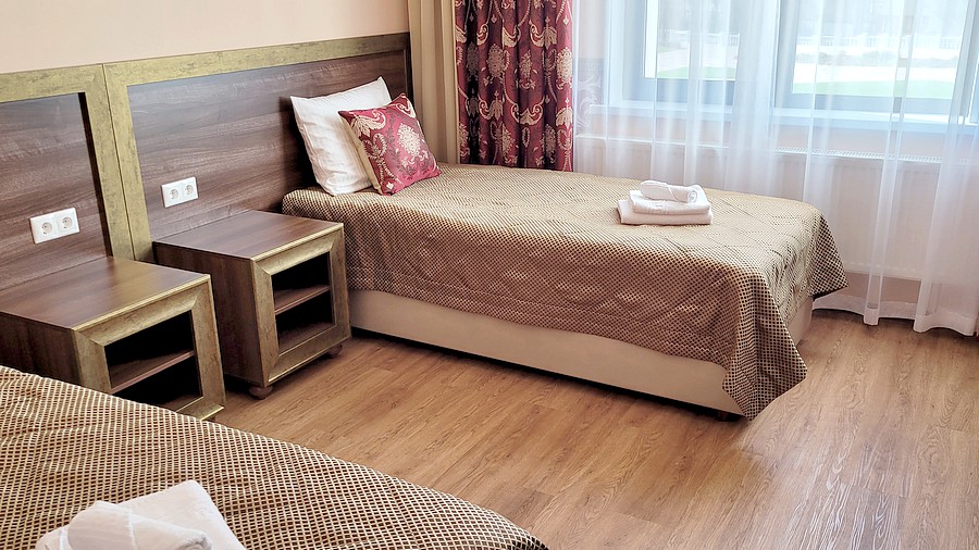 После реновации номерной фонд санатория значительно расширился. Теперь гостей принимают четыре спальных корпуса, соединенных между собой крытыми утепленными галереями. Это позволяет комфортно перемещаться между жилыми, лечебными и досуговыми зонами в любую погоду.