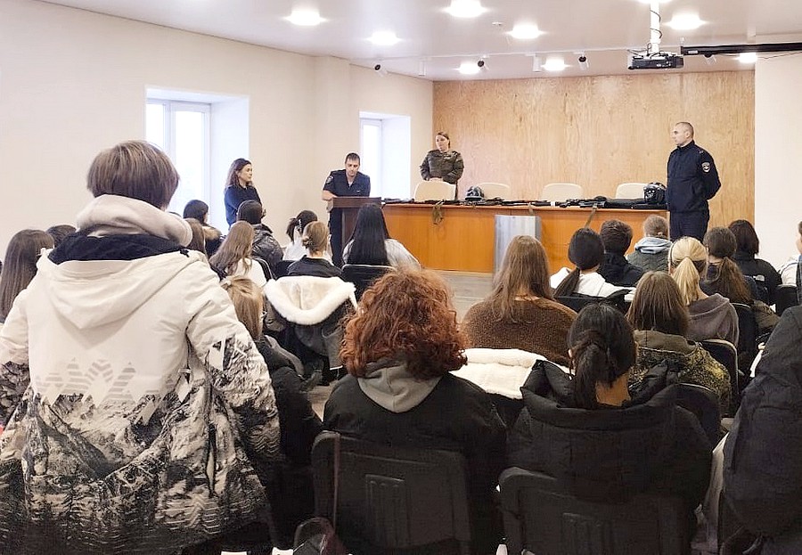 Будущие выпускники заинтересованно слушали Вадима Кирина, инструктора по профессиональной, служебной и физической подготовке (сотрудник группы по работе с личным составом), с информацией о поступлении в высшие учебные заведения системы МВД России.