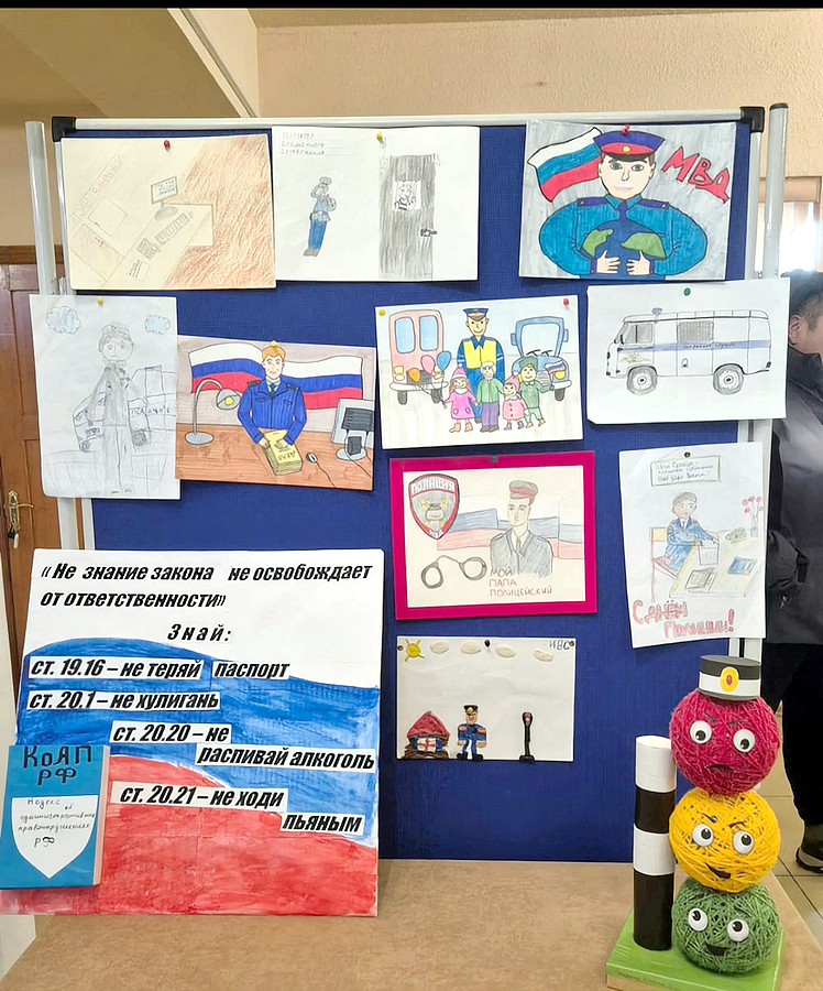 В фойе перед входом в зрительный зал гостей встречала оформленная выставка рисунков и поделок участников конкурса «Мои родные работают в полиции».