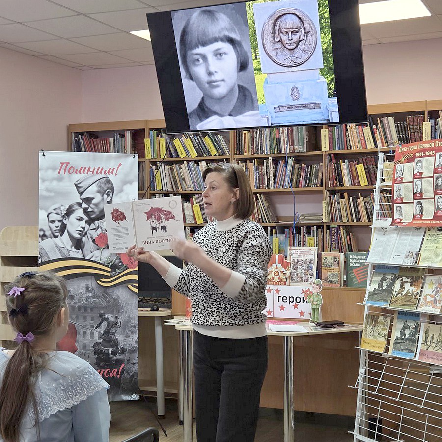 В преддверии этой памятной даты Детская библиотека распахнула свои двери для юных читателей, приглашая их на патриотический час «Подвиг, вошедший в историю». Первая часть мероприятия поведала об истоках этой скорбной даты. Затем, во второй части, которая называлась «Пионеры - герои войны», со страниц истории сошли юные герои, чьи имена и подвиги навечно вписаны в суровую летопись военных лет. Их лица, запечатленные в кадрах военной хроники, смотрели на нас с немым укором и призывом к миру. В разделе «Прочти книгу, стань ближе к подвигу» звучали трогательные строки из произведений, рассказывающих о детях, чье детство безжалостно опалила война. В завершение мероприятия участники погрузились в историю Зины Портновой – юной героини Великой Отечественной войны. Её подвиг, совершённый десятилетия назад, до сих пор поражает мужеством и самоотверженностью. 20 февраля 2026 года Зине исполнилось бы 100 лет. Ребята узнали о её счастливом пионерском детстве, о страшной цене, которую ей пришлось заплатить за участие в подпольной борьбе, о нечеловеческих пытках, не сломивших её волю, и о невероятной стойкости до последнего вздоха.