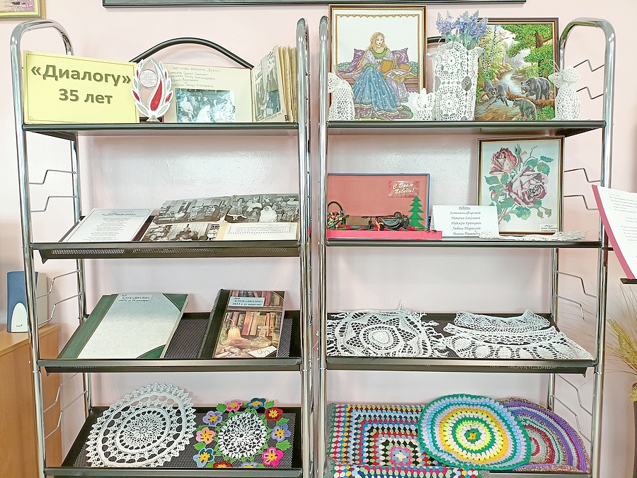 В юбилейную 35-ю встречу в читальном зале библиотеки собрались участники клуба и уважаемые гости, чтобы торжественно отметить эту дату. Здесь же была организована выставка «Диалогу» 35 лет, где были представлены фотографии и альбомы, повествующие о жизни клуба, а также изделия декоративно-прикладного творчества мастериц клуба и стихи, посвященные «Диалогу» в разные годы. Раиса Ивановна выступала в роли ведущей праздника и полноправной хозяйки, как всегда доброго, теплого и уютного «Диалога». Рассказывая историю создания и существования клуба, она «перелистывала» фотоальбомы и демонстрировала видеоролики, созданные сотрудниками библиотеки.