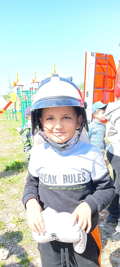 Затем последовало знакомство с особенностями работы пожарных и их боевой одеждой, каждый ребенок имел возможность примерить «боёвку». Интересным моментом занятия стала демонстрация пожарного автомобиля, его пожарно-технического вооружения и возможностей тушения пожаров. В течение получаса дети изучали машину как снаружи, так и внутри, пересмотрели и потрогали все, что было можно. Так же пожарные показали, как подаются звуковые и голосовые сигналы, объяснили для чего пожарный автомобиль оборудован такими сигнальными устройствами.