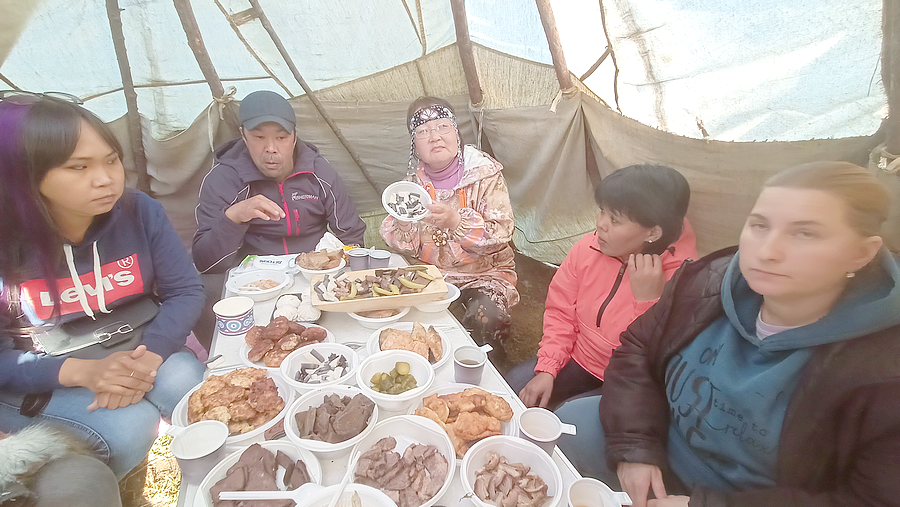 На этом обрядовая часть закончилась и пришло время подкрепиться. В стойбищах ждала горячая наваристая уха, рыба жареная, вяленая, малосоленая, котлеты, целебный таежный чай с лепешками и многое другое. Например, в стойбище п. Ола в этом году, помимо рыбных, были предложены блюда из морского исполина – кита, добытого морскими охотниками Чукотки. Этот поистине редчайший деликатес привез В. Ринтытегин (вед. хореограф северных танцев по СВ и ДВ РФ). Хозяева стойбищ соревновались в номинациях «Национальное блюдо» и «Лучшая хозяйка». Специальная комиссия проводила дегустацию блюд и оценивала убранство национального жилища. Победительницей конкурса «Национальное блюдо» стала О. Эхех из Омсукчана, а лучшей хозяйкой - М. Коркопская из Эвенска.