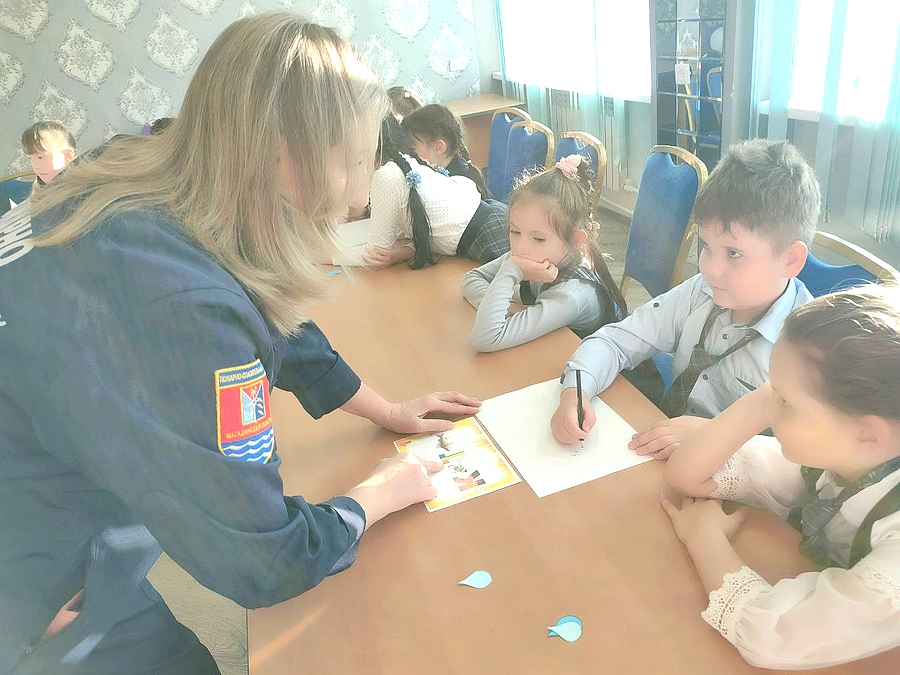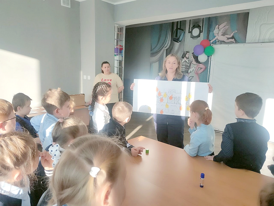 Школьники отгадывали загадки, отвечали на вопросы, разгадывали ребусы, за каждый правильный ответ они получали капельки. Затем на предлагаемой картинке с изображением кухни находили опасные ситуации, которые могут привести к пожару, и отмечали их огоньками. Рассказывали, по какому номеру телефона нужно звонить и как правильно вызывать пожарных. После чего вместе с пожарным «потушили возгорания на кухне».