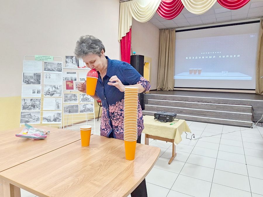 И началось путешествие в детство. Все участники с азартом раскручивали плечики для одежды в состязании «Крутящий момент», переносили стаканчики при помощи воздушного шарика в состязании «Воздушный курьер», вызывали настоящее цунами, силой дыхания перемещая теннисные шарики из одной емкости с водой в другую, собирали макароны при помощи тоненьких спагетти, стреляли из «катапульты».