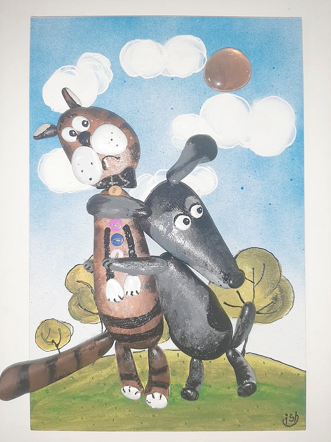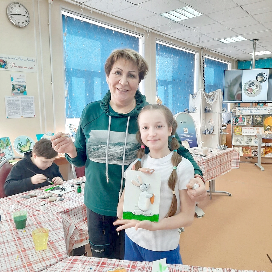 Юные художники отнеслись к предварительной подготовке очень серьезно: рассматривали камни, их фактуру и изгибы, как им рассказала наша гостья. Они прикладывали камни друг к другу, меняли их местами и подходили к каменной куче на полу снова и снова. И вот на холстах камни сложились в узнаваемые фигуры - солдат, щенок, кошка, собака, кружка чая с бутербродом, двуглавый орел, зайка, герои любимого мультфильма… Дальше происходили чудеса! Ребята склеивали камни и грунтовали их на холсте, потом расписывали. А Ирина Алексеевна уделяла время каждому, периодически подбадривая, подсказывая и помогая выполнить работу. И дети, и мы, взрослые, чувствовали ее доброту, наверное, от того, что она не только творческий человек, а мама двоих сыновей и бабушка троих внуков. И так всем хорошо было с ней рядом, что никто не хотел расставаться и все спрашивали когда будет следующая встреча, которая обязательно состоится.