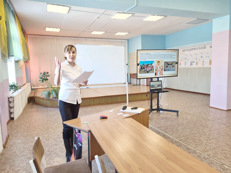 С организацией дополнительного образования в условиях летнего лагеря «Нёлтэн Хедекэн» познакомила коллег Е. М. Капроска, учитель-логопед МКОУ «Начальная школа-детский сад с. Гадля», где реализуется программа «Наш язык». Среди педагогов школы нет носителей языков малочисленных народов Севера. Для того чтобы научить ребят элементарным знаниям эвенского языка, обычаям и традициям этого народа, приглашаются педагоги из других учреждений округа и старейшие жители поселения. Во время проведения мастер-класса Екатерина Михайловна познакомила участников семинара с приёмами и методами запоминания эвенских слов.