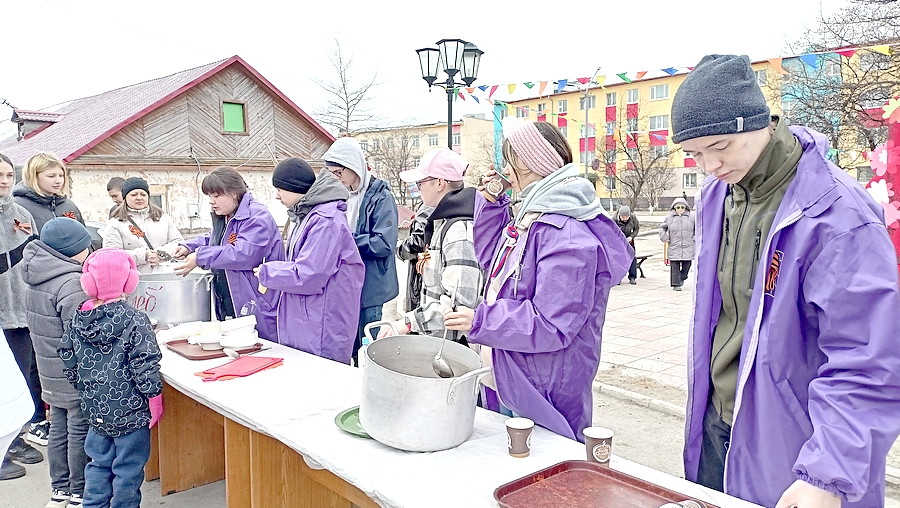 Для всех желающих на площади развернулась военно-полевая кухня с чаем и традиционной гречневой кашей, на «Прифронтовом привале» звучали песни военных лет, аккомпанировал на баяне А. Бобарико. Прошли показательные выступления по рукопашному бою «Служить России суждено тебе и мне». Их провел президент Магаданской региональной физкультурной спортивной общественной организации «Федерация рукопашного боя» Сергей Бубенко. Пограничники воинской части п. Ола представили выставку современного оружия: бронежилеты, автоматы, пулеметы и бронетехнику. Школьники средней школы под руководством Ирины Поповой, и. о. руководителя ВПК «СПЕЦНАЗ», занимались разборкой-сборкой автоматов. Желающие оставили себе на память фотографии во «Фронтовом фотосалоне». Демонстрацией художественных фильмов о военных событиях Великой Отечественной вой-ны завершился праздник Великой Победы.