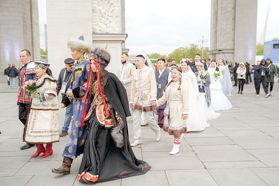 «12 мая волноваться стали с раннего утра. После завтрака надели свои эвенские свадебные костюмы и вышли на крыльцо гостиницы. Там уже было много молодых пар в своих национальных костюмах, представляли богатую культуру регионов, откуда они приехали. Профессиональные фотографы снимали пары. На фотосессию ушло около 2 часов. Потом все выдвинулись на ВДНХ», – начал Виктор рассказ о самом главном дне в их с Дашей совместной жизни, а Даша продолжила: «Для нас большая честь стать участниками официального открытия 1-го Всероссийского свадебного фестиваля. Ближе к двум часам дня мы выстроились в колонну для массового свадебного шествия от арки главного входа ВДНХ до главной уличной сцены выставки «Россия» в сопровождении цыганского музыкального ансамбля, гармонистов, аниматоров и цирковых артистов. Мы даже не замечали прохлады, настолько у нас захватывало дух от происходящего. Дошли до главной уличной площадки ВДНХ, где нас ждали региональные представители ЗАГС. Каждая пара встала у своей тумбы, на которой лежали кольца и акты о заключении брака для подписи». Виктор же отметил, что новобрачные в национальных костюмах вызывали восторг зрителей и организаторов, а также гордость за свою многонациональную Родину.