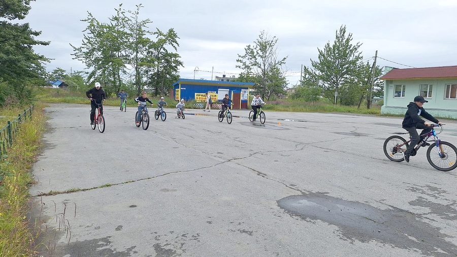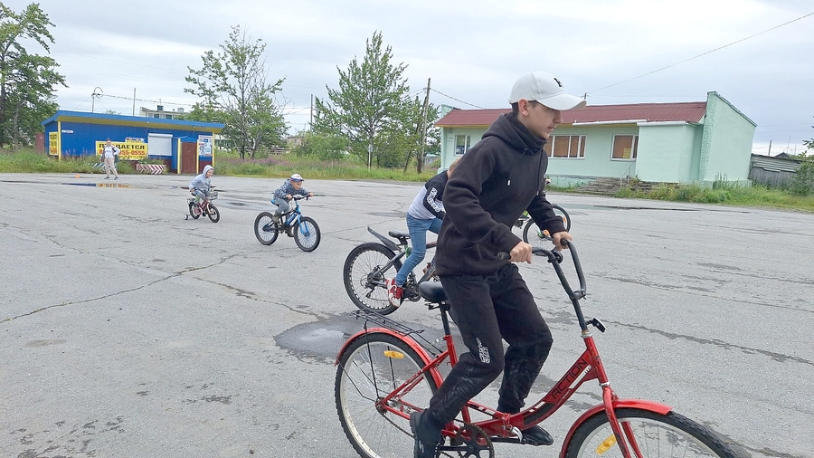 Ребята на велосипедах соревновались в скоростной гонке. На старт вышли дети разного возраста и на разных велосипедах, но к финишу все устремились с желанием быть первыми, даже маленький Семён на трехколесном велосипеде!
