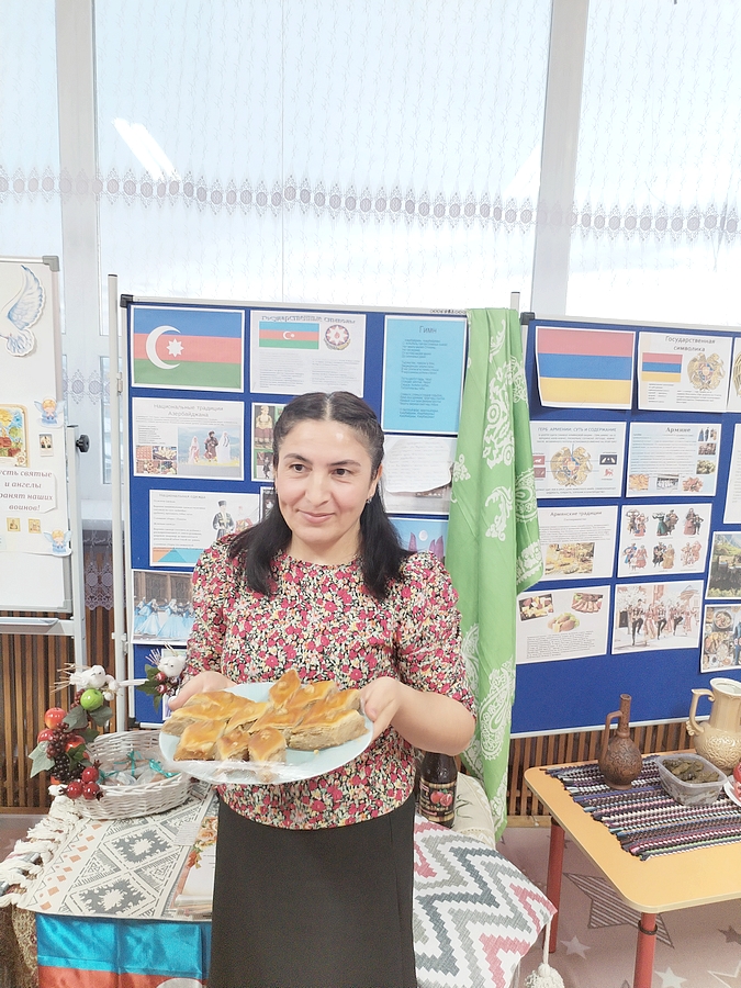 В детском саду работает воспитателем Шахсанам Юнисовна Ширинова, вместе со своей племянницей Гюнель Садиковой она рассказала о республике Азербайджан, показала красочные предметы быта их народа. Шахсанам Юнисовна прочитала для всех стихотворение на азербайджанском языке о красоте родных мест, о доброте азербайджанского народа. А Гунель и ее подруга Диана в национальных костюмах исполнили танец «Узундере».