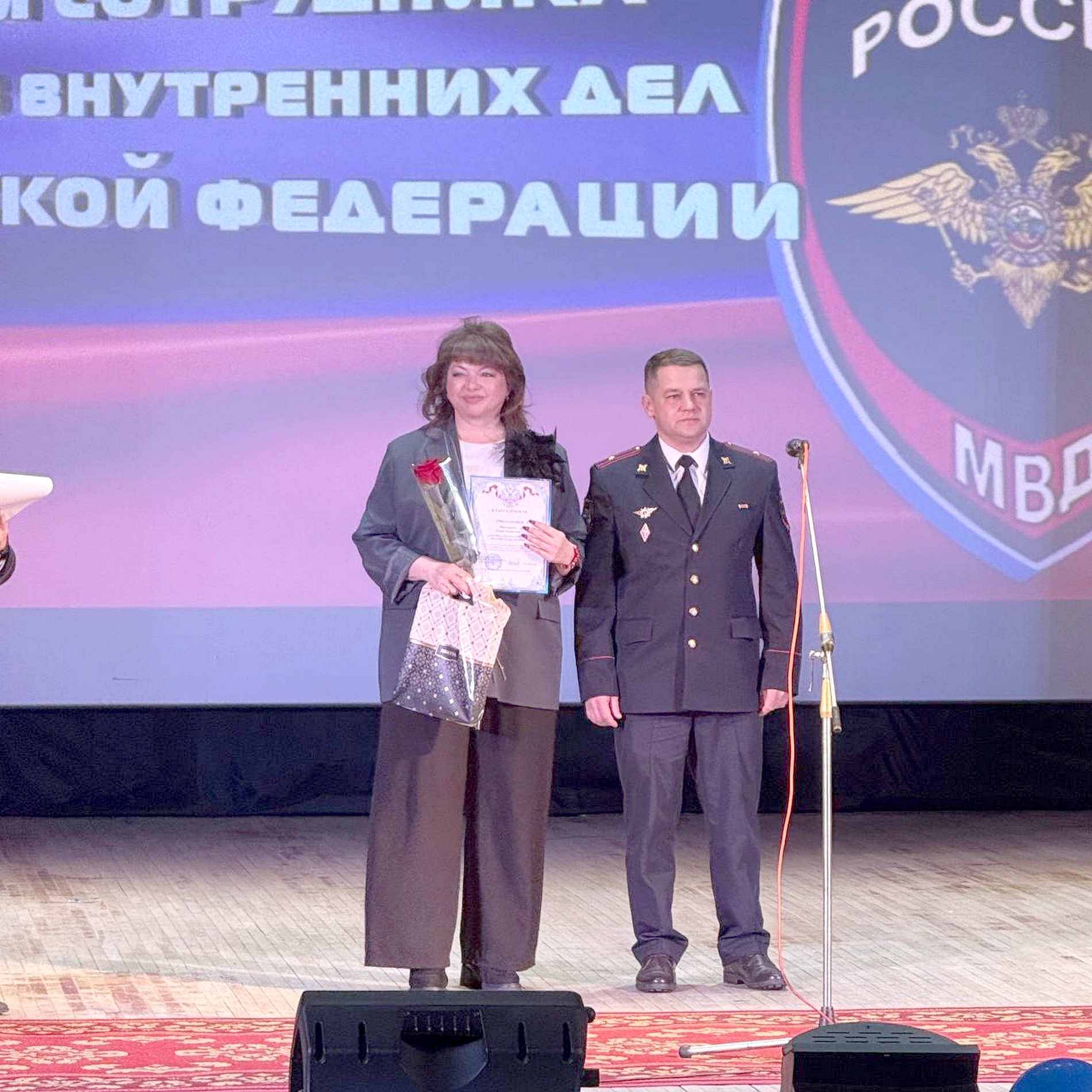 Далее представители Общественного совета при Отд МВД России «Ольское» О. Е. Маринкевич и Е. В. Дорофеева поздравили с праздником и вручили сотрудникам благодарности за успешную службу и взаимодействие с Общественным советом, наградили победителей, призеров и участников конкурса «Мои родные работают в полиции».