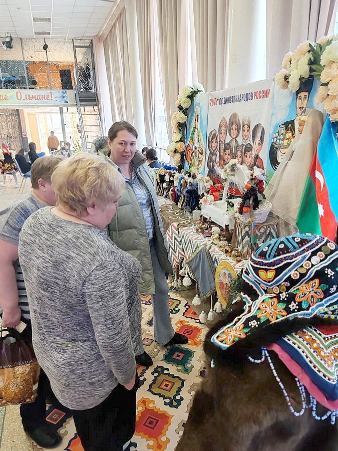 Уже при входе в Центр культуры кадеты клуба «Спецназ» (рук. И. Костюк) торжественно встречали зрителей, поздравляя с праздником и создавая им праздничное настроение. До начала концерта гости знакомились в фойе с экспонатами, представленными хранителем фонда Ольского краеведческого музея И. Покатиловой, с фотографиями выставок «Верны долгу и Отечеству» и «Родина их не забудет» о героях СВО. На 2-м этаже Раде Гусейнова и Ирина Патрина, работники СДК с. Гадля, развернули выставку национальных сувениров, на которой представили культуру азербайджанского и эвенского народов. Красочные куклы и сувениры изготовлены руками участников кружка «Лавка мастеров» и его руководителем Раде Гусейновой. Работники ЦДО украшали желающих аквагримом.